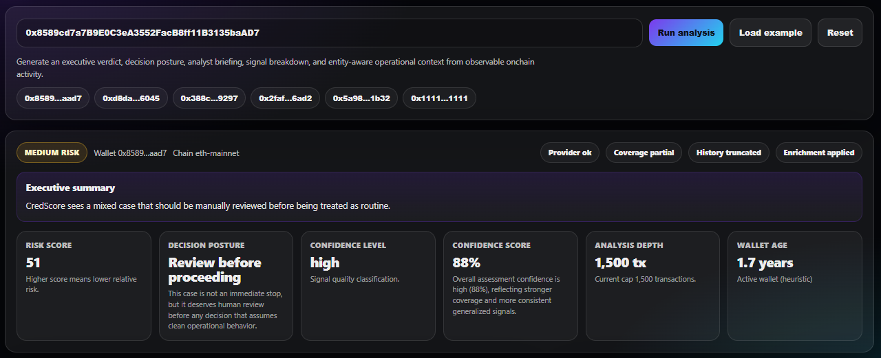 CredScore is for users who want a clearer read on wallet risk without getting buried in raw transaction history. Open the Desk, run a wallet, and review the briefing layer directly.